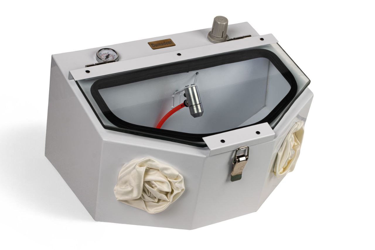 این نوع دستگاهها معمولاً دارای یک کابین کوچک هستند که ذرات ساینده را داخل آن پاشش میکنند. این کابین باعث جلوگیری از پخش شدن ذرات در محیط و حفظ سلامت کاربر میشود.